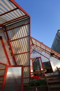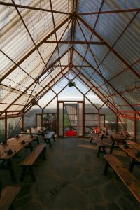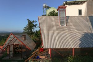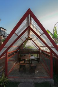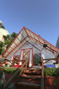 Vì quán chỉ hoạt động buổi tối, nên vật liệu được sử dụng có phần đặc thù. Điểm nhấn ở đây là các khối nhà “trong suốt” trở nên rất lung linh vào ban đêm, mang đến trải nghiệm thị giác từ cả bên ngoài và trong, buổi tối ở Pleiku rất mát mẻ và se se lạnh, thực hợp để tụ họp bạn bè và gia đình, cùng trò chuyện quanh một bàn ăn ấm cúng.