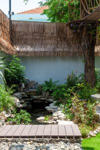Các không gian ngoài nhà như sân vườn, ao cá và hồ bơi trên mái là những điểm nhấn đặc thù, mang đến sự khác biệt cũng như thể hiện chất lượng cuộc sống cao và cái gu của gia chủ.