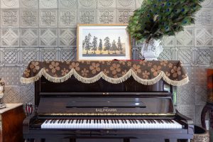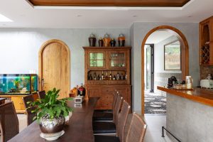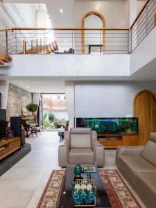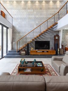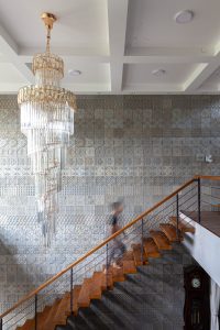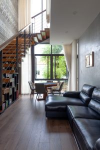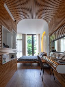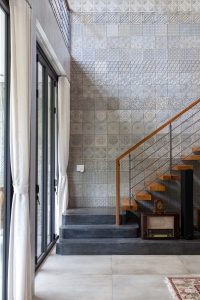 Phần nội thất được sử dụng tone màu trắng chủ đạo kết hợp gỗ nâu dễ chịu, điểm nhấn chính là mảng tường thông tầng được ốp gạch hoa văn trang trí, xuyên suốt chiều cao của ngôi nhà. Các chi tiết và cách bày trí mang đậm tính tối giản, nhẹ nhàng và mềm mại